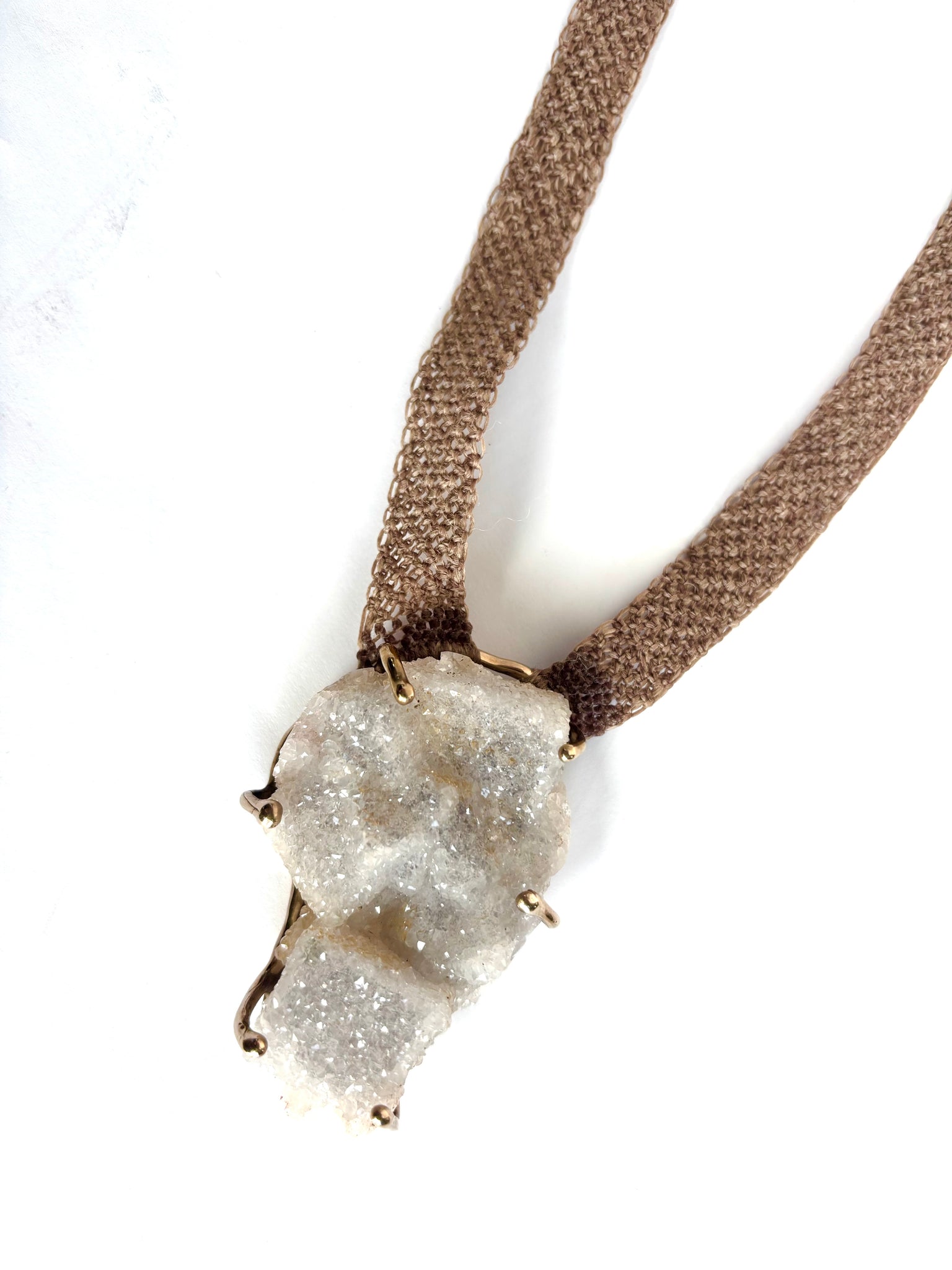 This sparkly druzy covered fluorite (which does fluoresce blue in UV light) - it’s impossible to capture the sparkle in this specimen, in the real.. it’s fascinating! (Measures approx. 2”x1”) The cubes of fluorite are covered in druzy which is set in a custom made bronze setting and then I use macramé to create the necklace - at this time the length is unfinished so I can create the length you like. One of a kind.