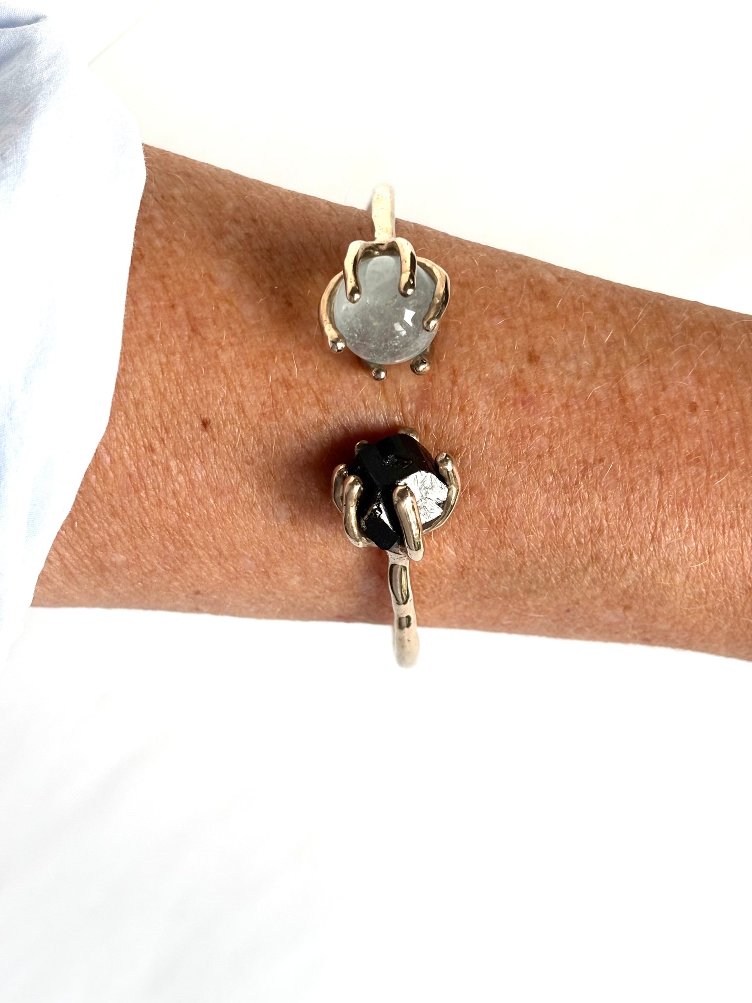 Open bracelet with cage-set aquamarine sphere (that spins in it setting) and double terminated black tourmaline set in bronze bracelet. I carve this piece in wax and then cast into bronze. This piece would be suitable for a small, medium or large wrist - one of a kind.