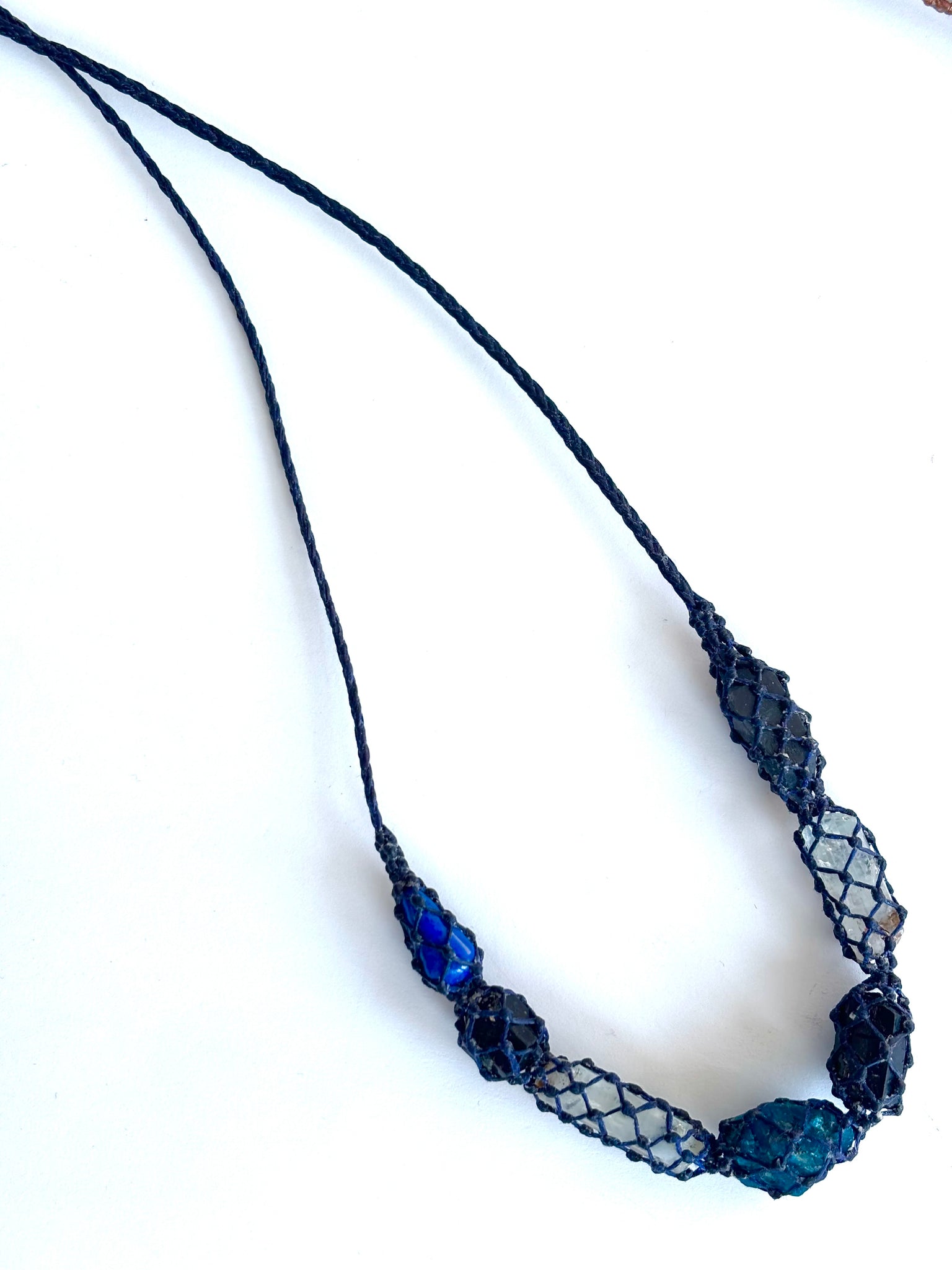 This netted gemstone necklace has (left to right) lapis, black tourmaline, clear topaz, blue apatite, black tourmaline, aquamarine, and smoky quartz - all working in harmony for you netted in  30” waxed blue cord with a jade bead at the top to adjust the length. One of a kind - each of these stones is so special on their own - the black tourmaline is beautifully terminated, the topaz also and completely natural. The aquamarine is naturally terminated and clear and glossy. The smoky is morian dark.. almost black very unique and my favorite kind.