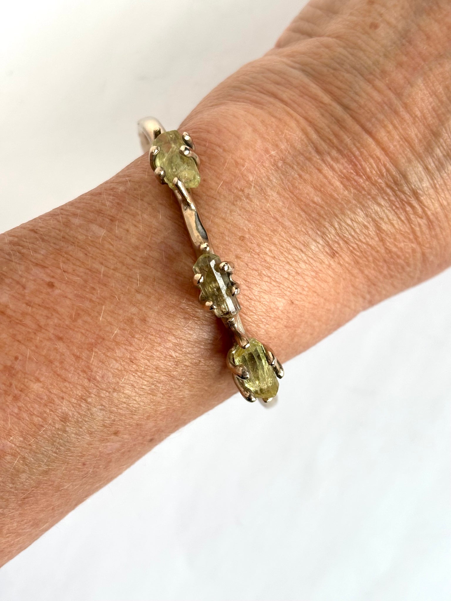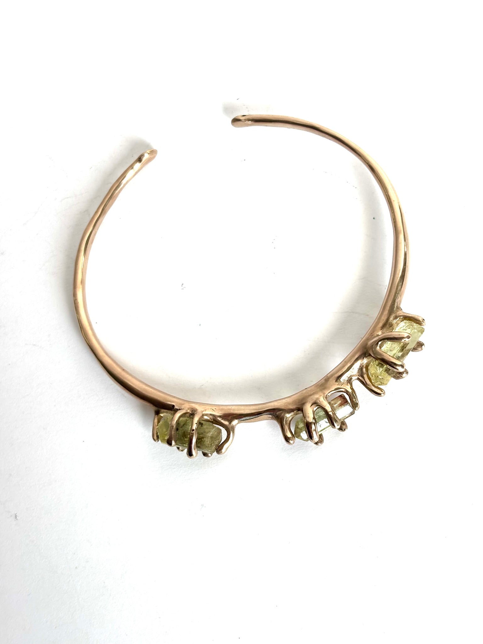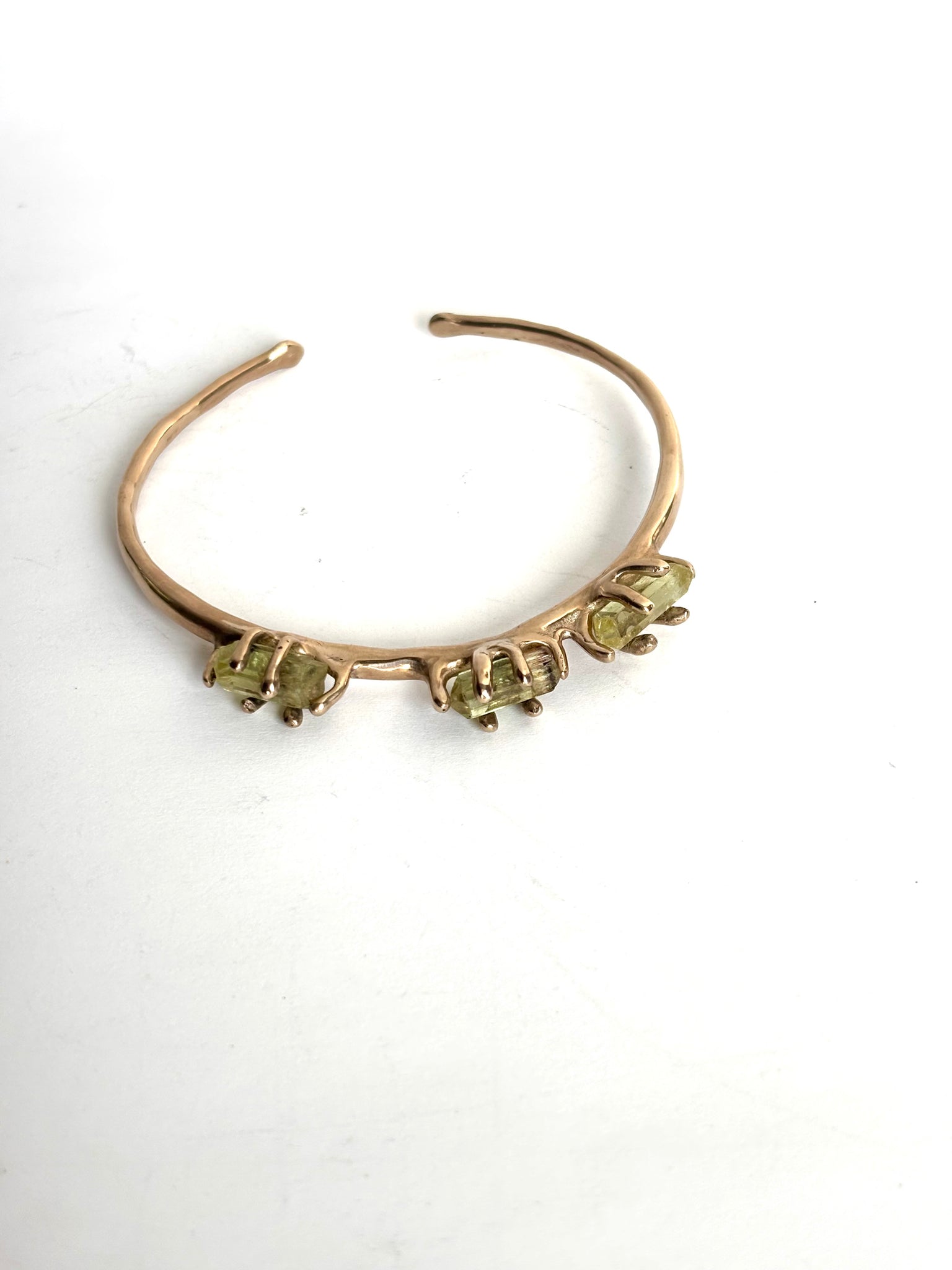 Bracelet with three natural yellow/green Apatites (with natural terminations) claw-set in a bronze bracelet. This piece is first carved in wax and then cast into bronze. This piece will fit a smal, medium or large size wrist. One of a kind.