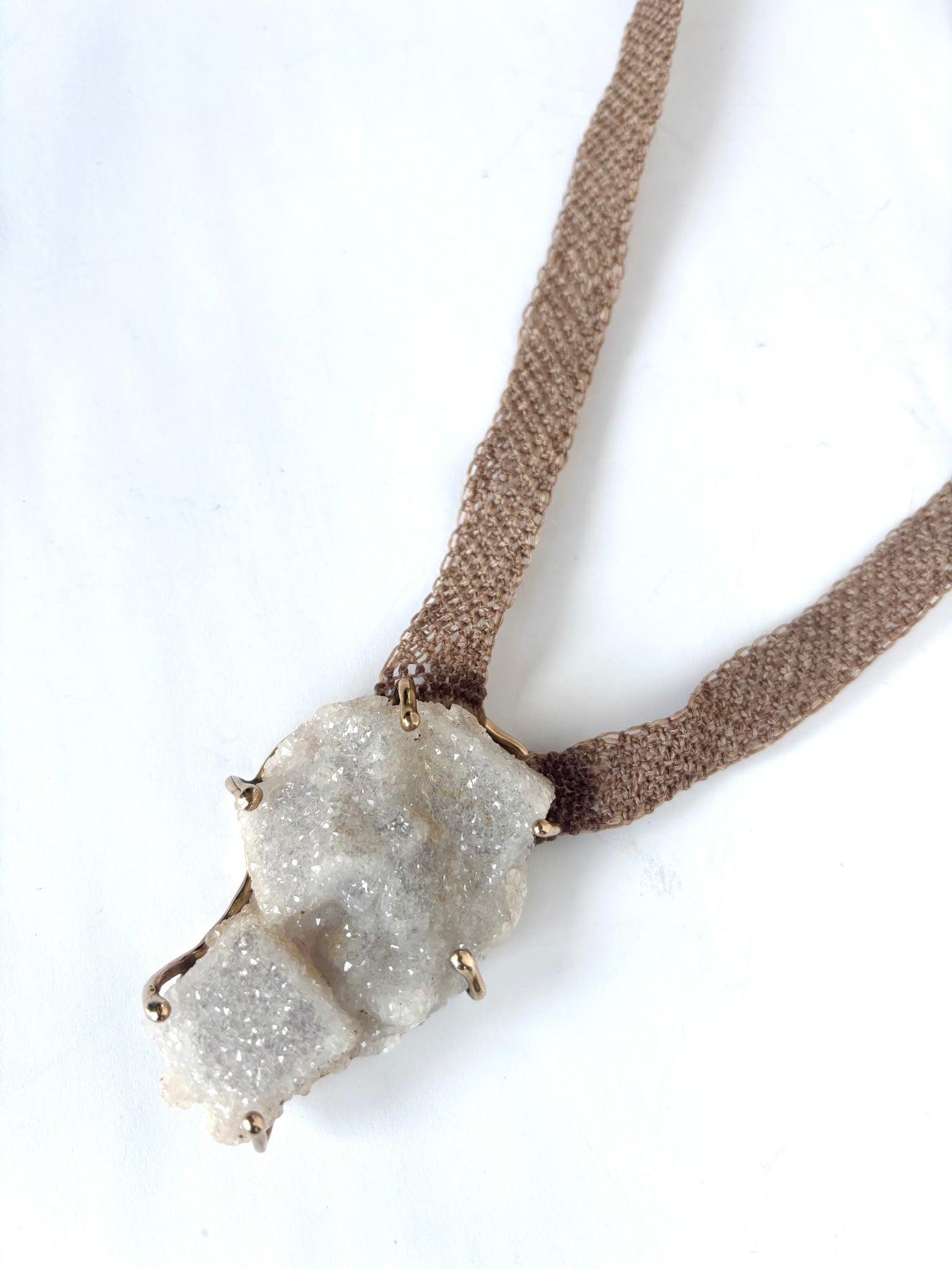 This sparkly druzy covered fluorite (which does fluoresce blue in UV light) - it’s impossible to capture the sparkle in this specimen, in the real.. it’s fascinating! (Measures approx. 2”x1”) The cubes of fluorite are covered in druzy which is set in a custom made bronze setting and then I use macramé to create the necklace - at this time the length is unfinished so I can create the length you like. One of a kind.