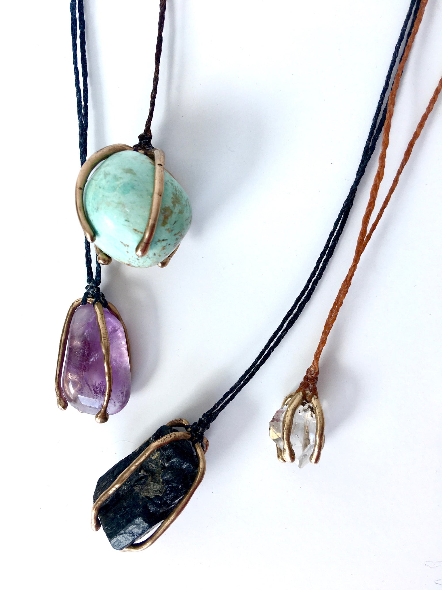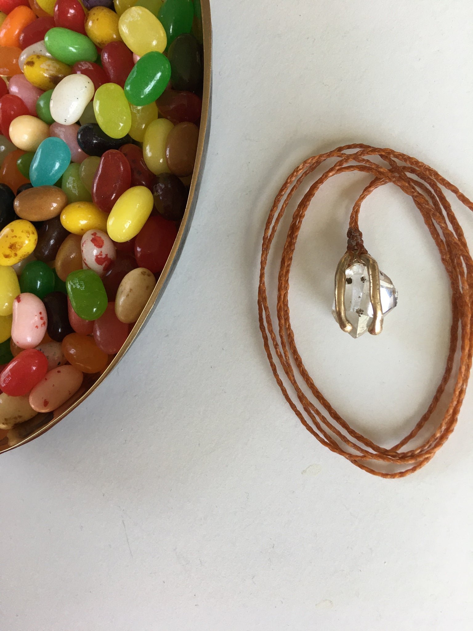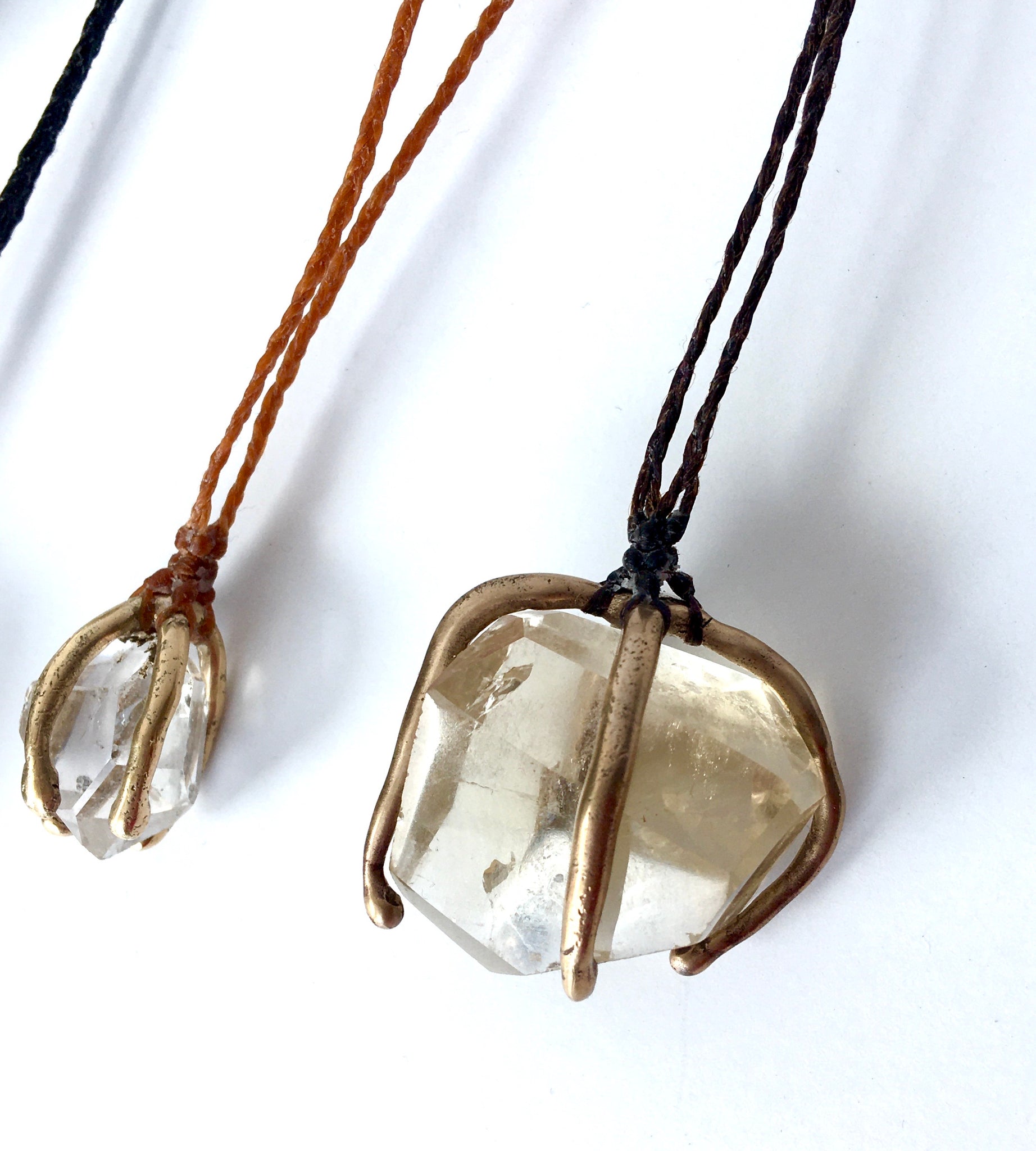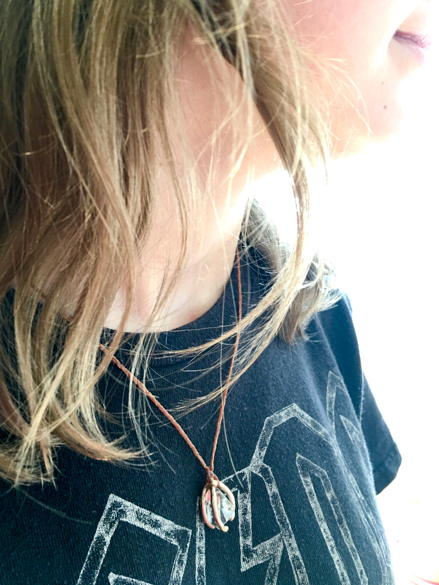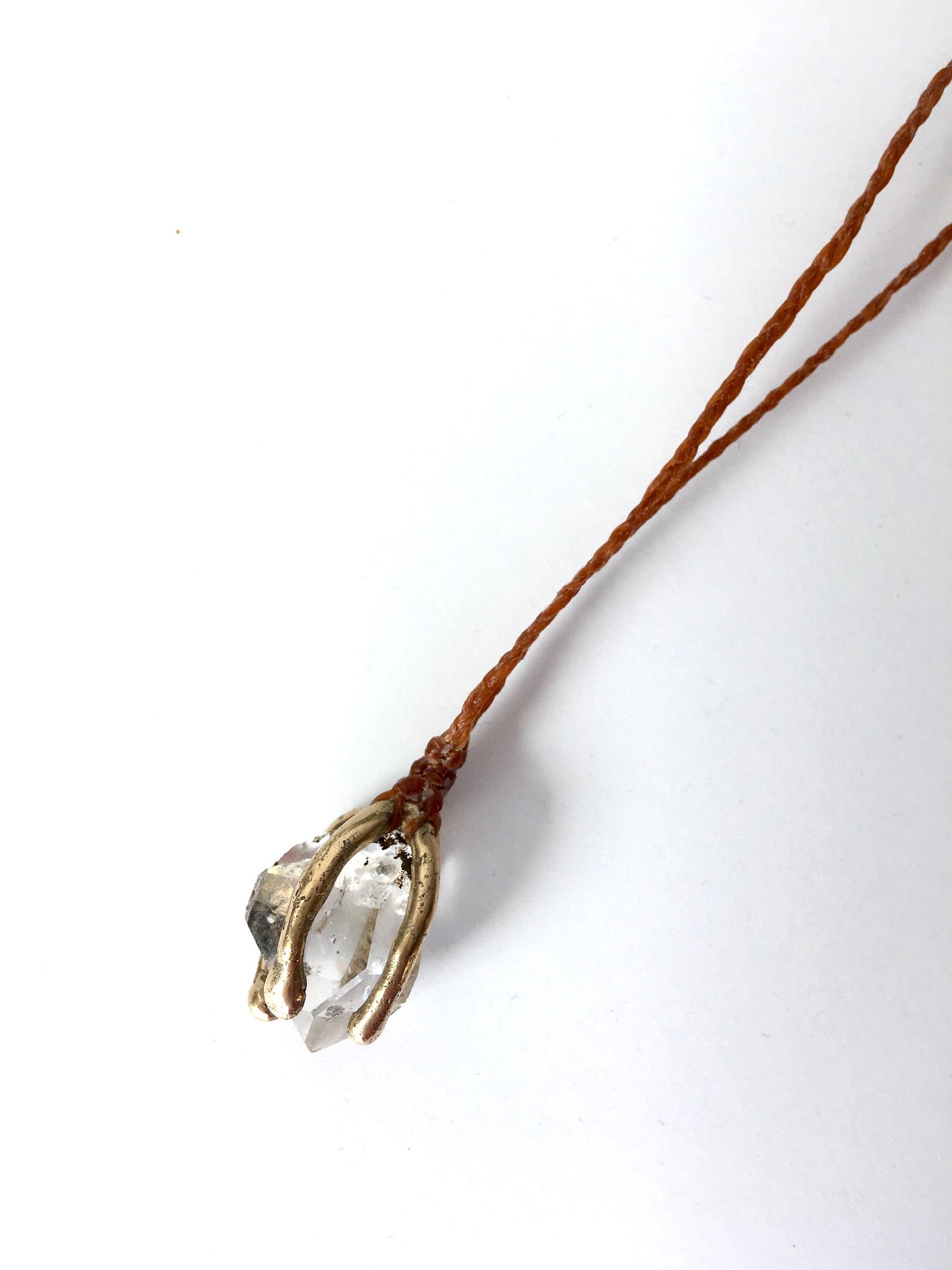 This is a small and beautifullt clear herkimer diamond (approx 3 x 2cm) caged in 14k gold and hanging from an terra cotta braided cord with a clasp in back at approx. 18”