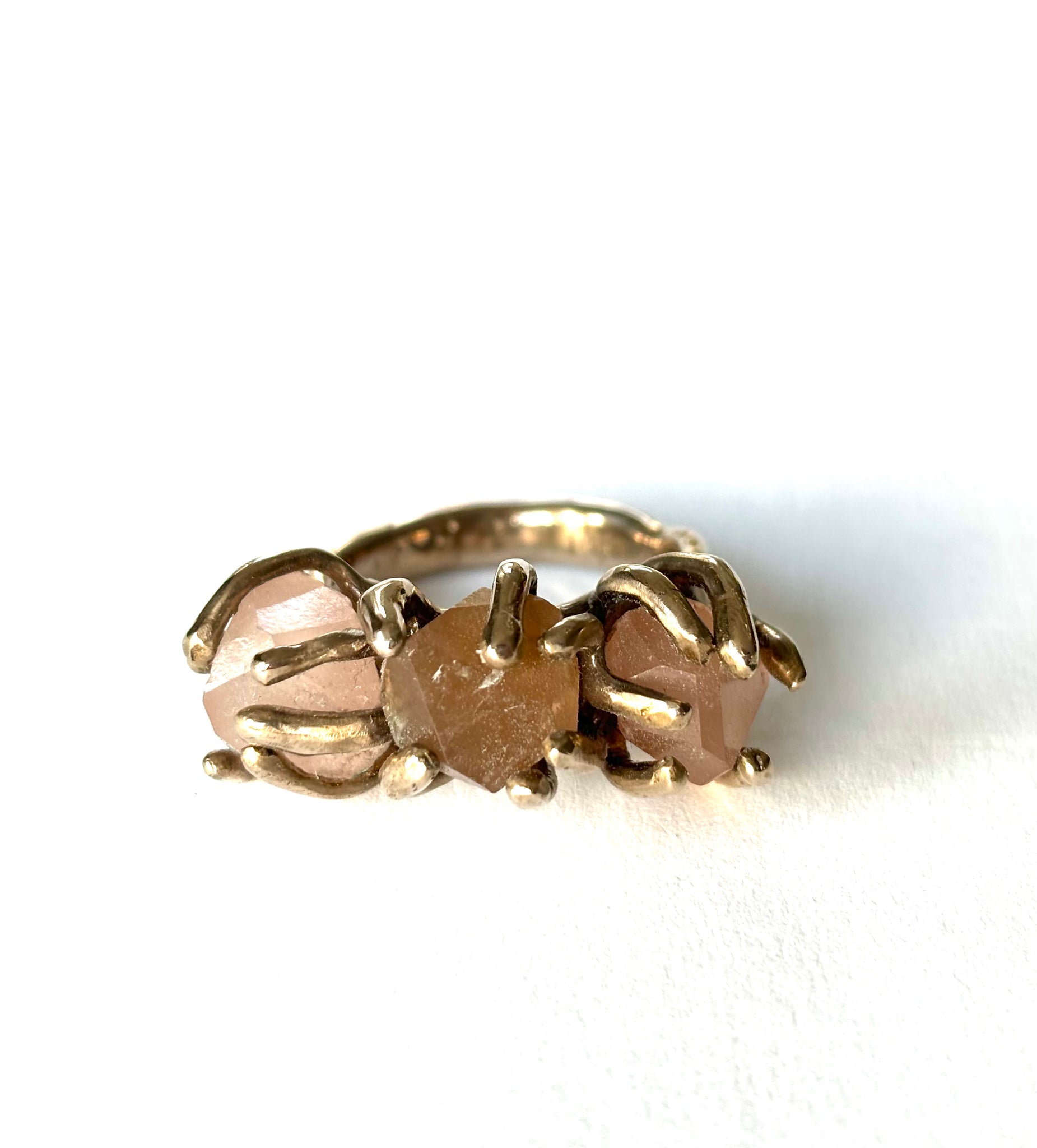Three pink diamond quartz - so named for their resemblance to Herkimer diamonds, they are double terminated peachy-pink quartz - so beautiful! Claw set in bronze ring - size 9.5 - I like to make things with stones in ‘threes’ three is a very harmonious number!