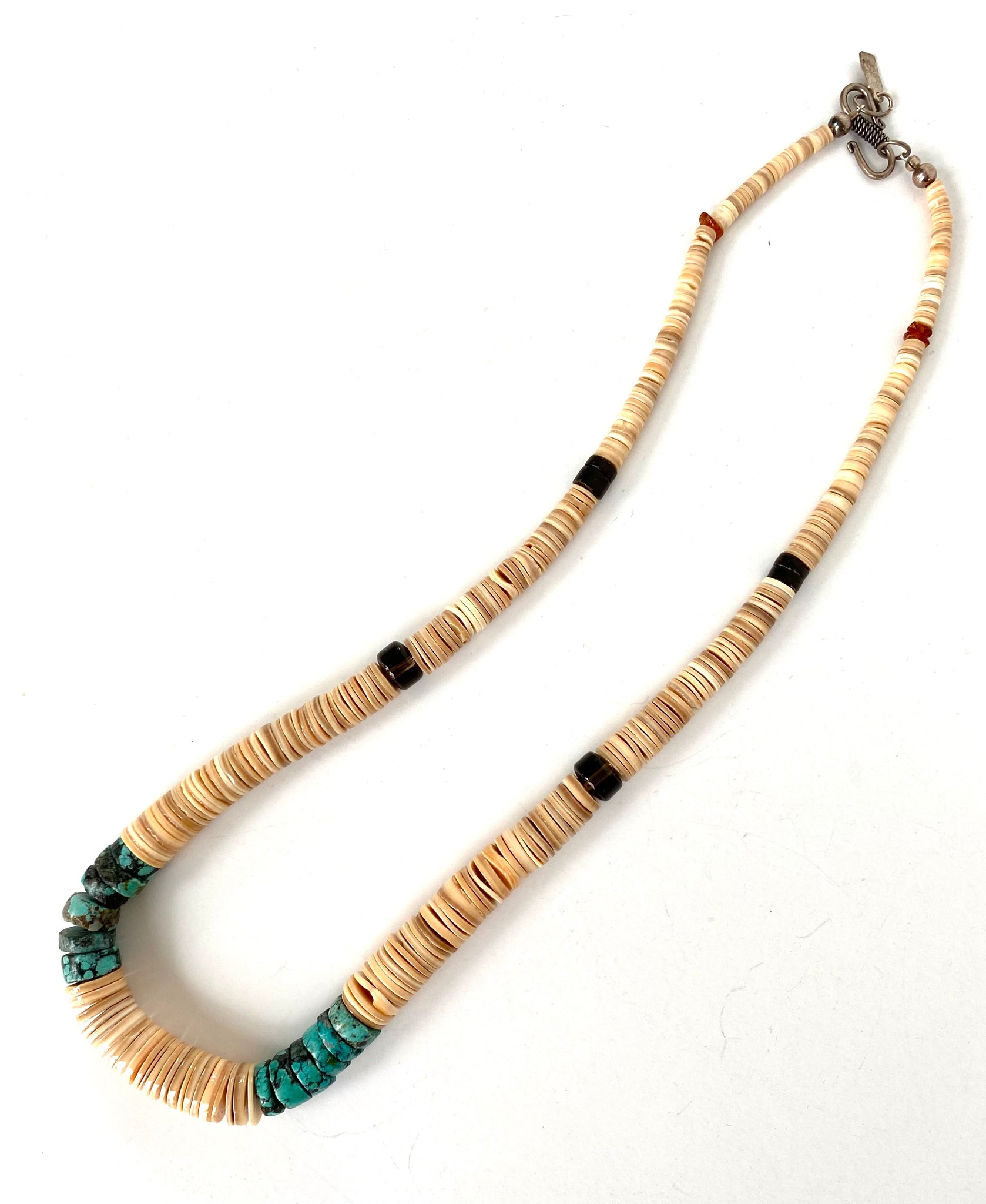 Vintage Navajo beaded necklace made of shell and turquoise with sterling silver clasp. 23” length.
