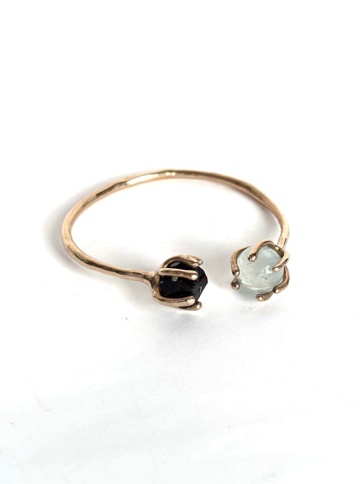 Open bracelet with cage-set aquamarine sphere (that spins in it setting) and double terminated black tourmaline set in bronze bracelet. I carve this piece in wax and then cast into bronze. This piece would be suitable for a small, medium or large wrist - one of a kind.