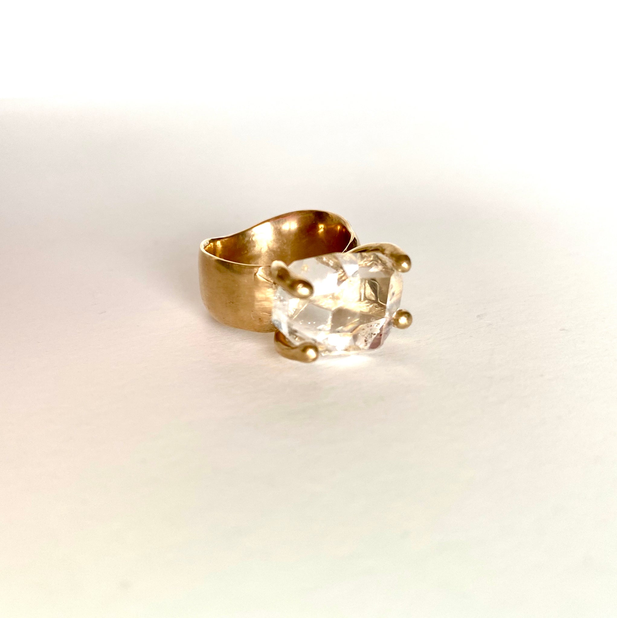 This herkimer diamond is set in a 14k gold band ring. Herkimer diamonds are found only in herkimer New York, I get mine from a man who has been mining his own claim by hand for, well a long long time! I visit him and together we pull together what I like to call ‘my stash!’ This particular herkimer is super clear and shaped beautifully. The beauty of these stones is that they are not cut (like most precious gemstones) they are found in their double terminated crystal shape. This ring is size 6. If you need another size you can commission me to make a ring for you... email me and we can work it out!