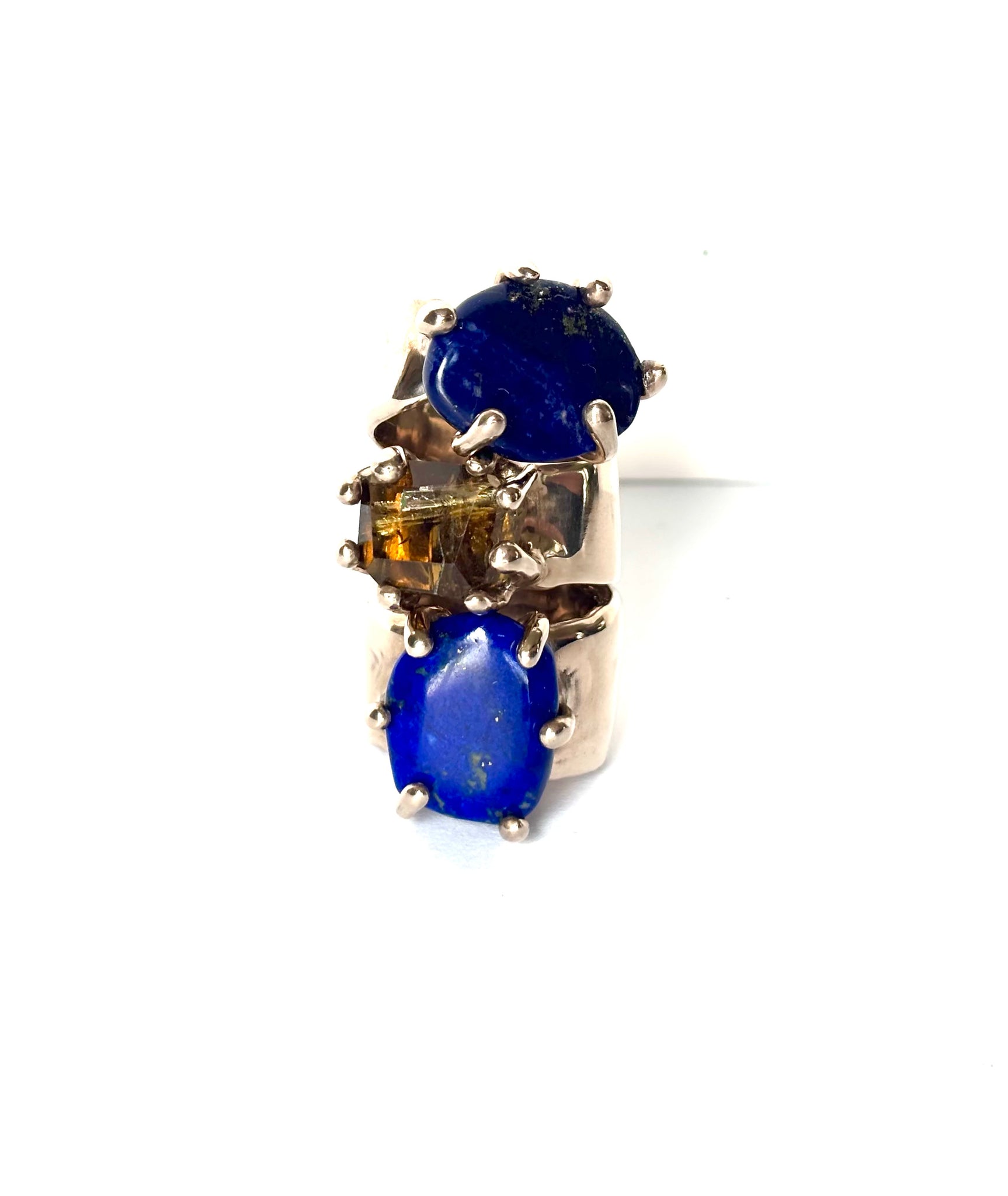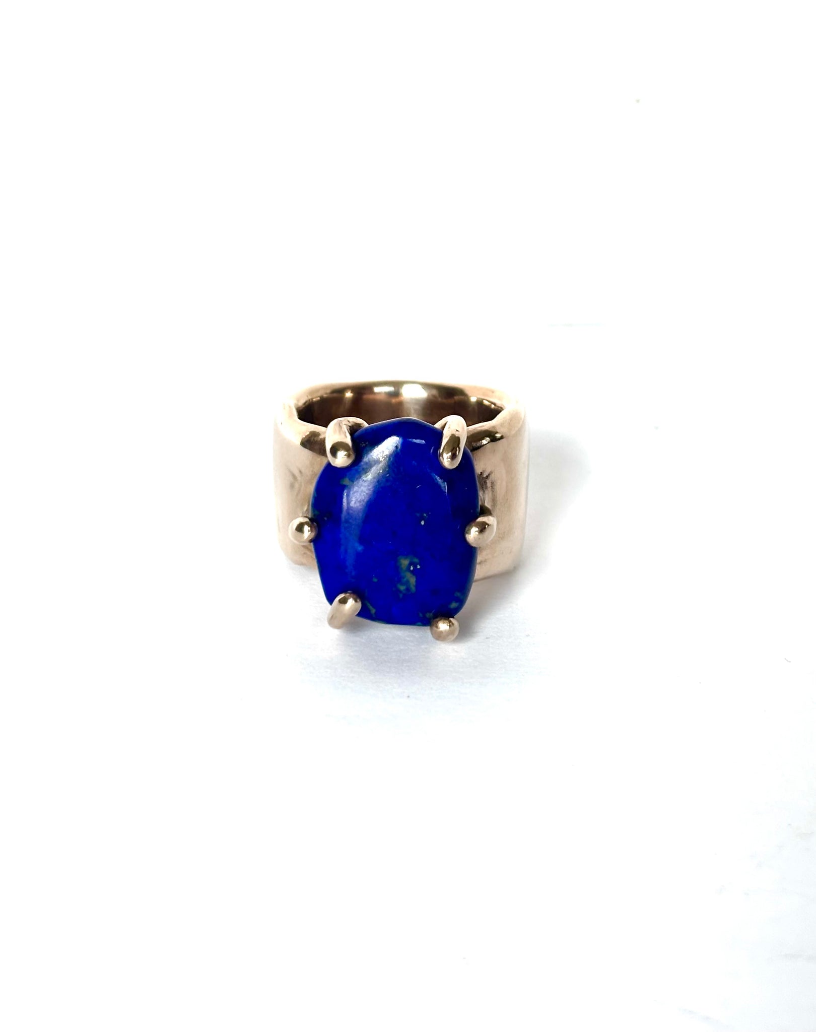Deep royal blue Lapis Lazuli stone prong set in bronze (band height is 1.5cm) ring size 8-8.5 - one of a kind - the Lapis has some nice markings of pyrite which looks like gold within the stone.