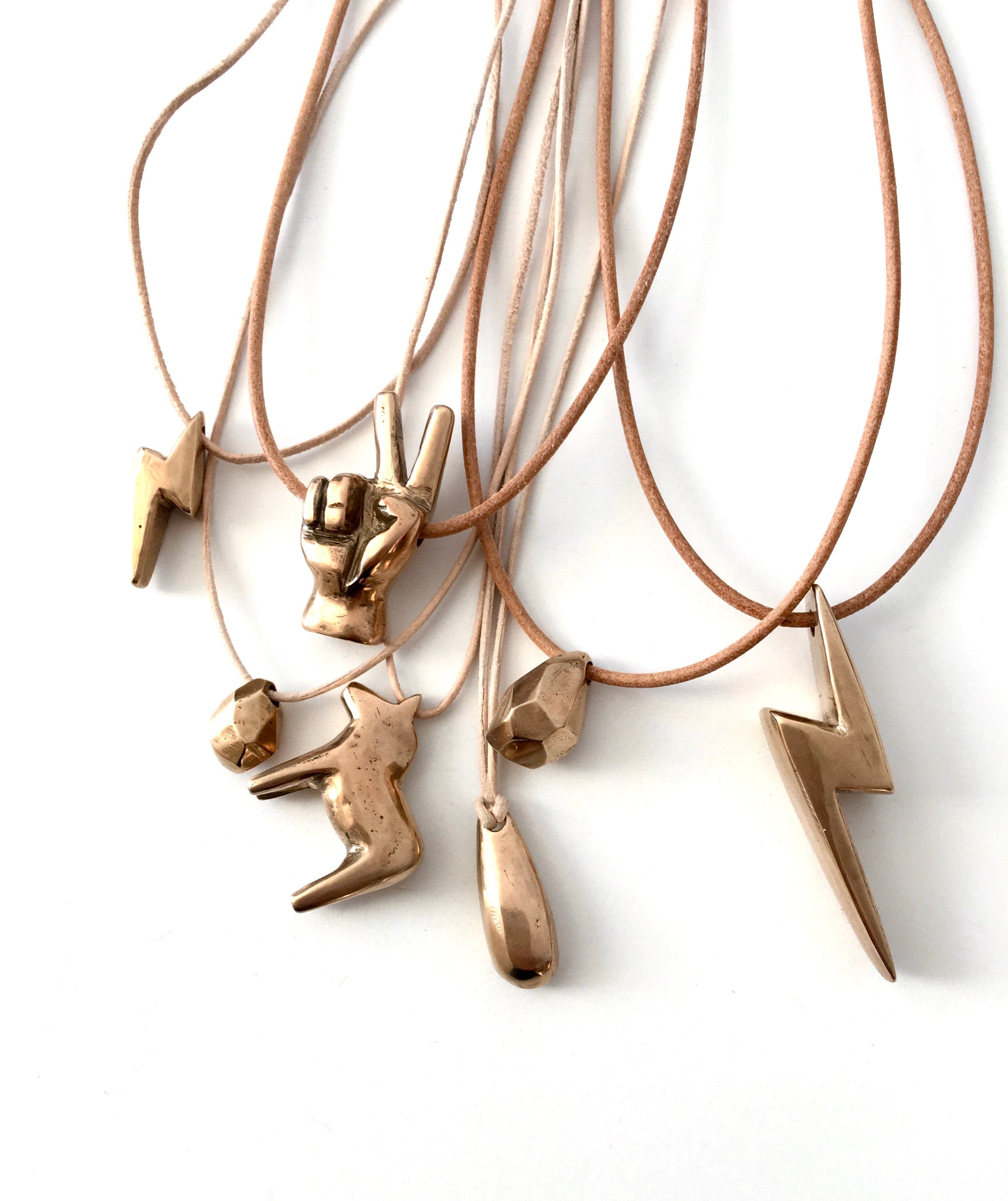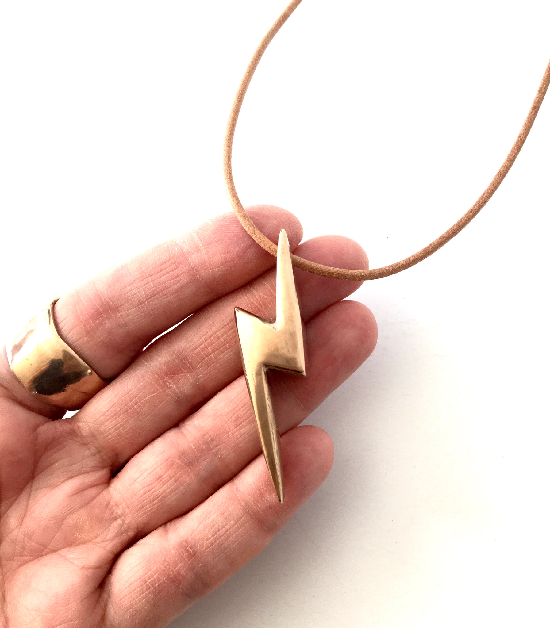 I made the lightning bolt (Shazam!) in a small and large size (for those bold folks) this is the larger of the two sizes. If you follow me on Instagram you know that the lightning bolt has always been my favorite emoji - it says so much for me but most of all it’s the electricity and zest for life that runs through everything I do and make. The bolt can be worn as a single charm or as part of a multi charm necklace (make sure you take note of its large size) I carved the bolt in wax and then I cast into the metal of your choice (gold price is an estimate and due to its fluctuating price I will quote exact price at the time of purchase or email me for a current quote). It measures approx 2” x 1” x 1/2” thick and cast in bronze and hangs on a leather cord (if you are vegan I have a beautiful cord which I use for my crystals and looks amazing braided). I usually have these in stock but it can take up to three weeks if I need to cast them - please feel free to contact me if you have any questions.