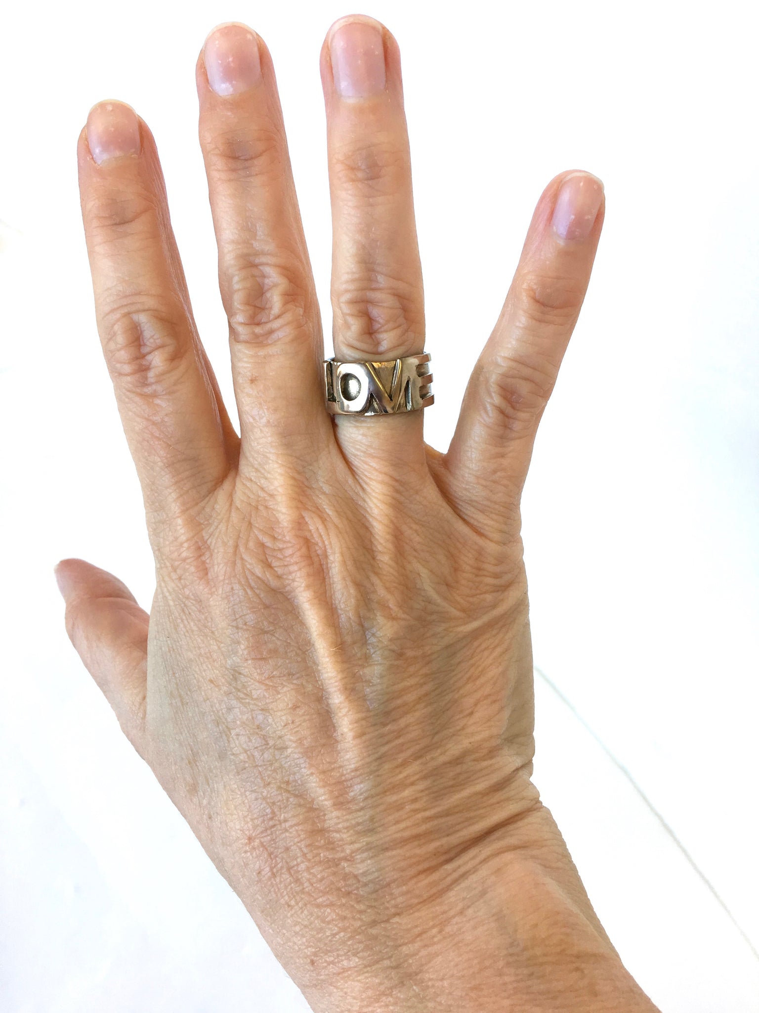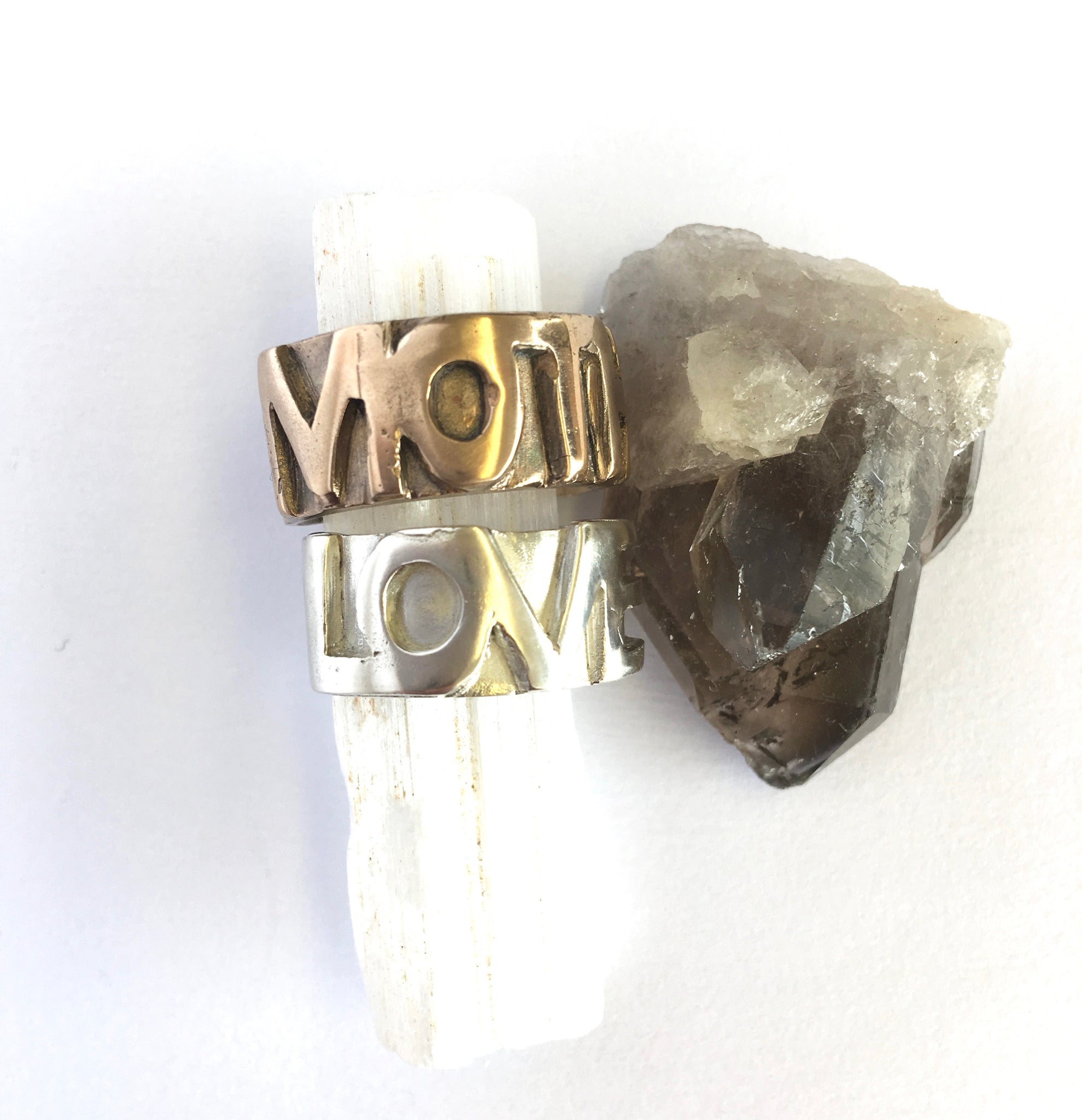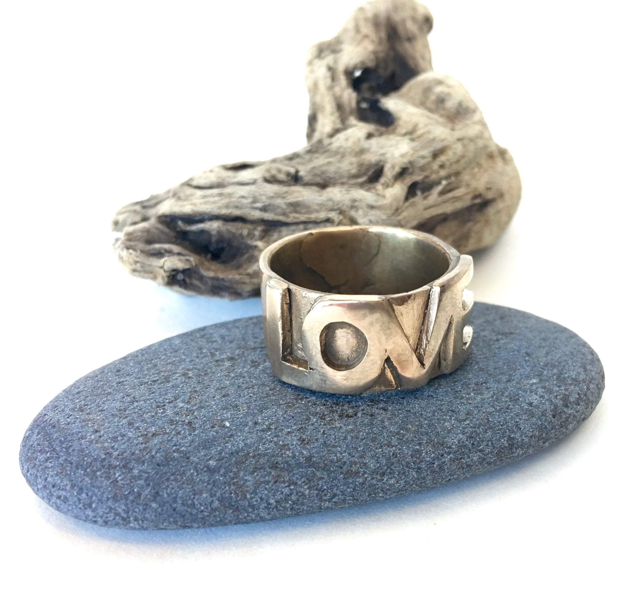 The LOVE ring is a hand carved band style ring. It's a beautiful message for a friend or to wear yourself. It is currently only made in size 7 and is approx. 3/8" in height so it's a comfortable fit. Choose from Sterling Silver, 14k gold or Bronze.