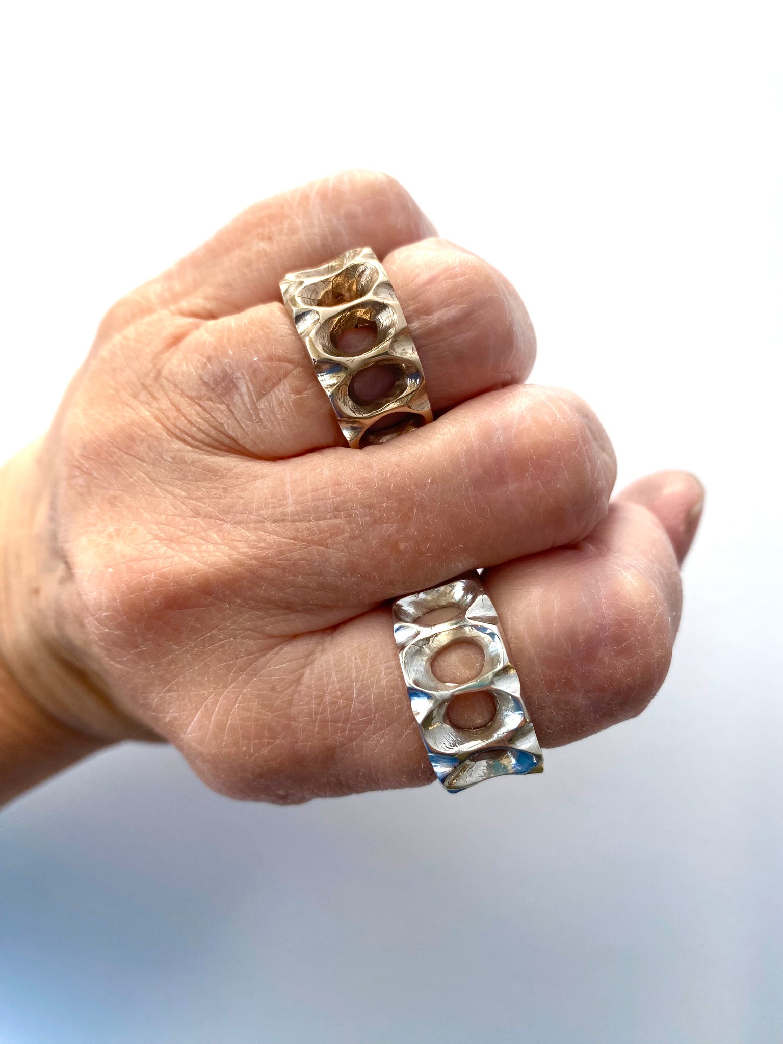 This ring is inspired by the old World Trade Center building, we lived in lower Manhattan for 10 years and those buildings were a big part of our love life with that city. We rode bikes everywhere and frequently after a late night out we would ride our bikes around the silent plaza between the two buildings - gorgeous. The Architects name is Minoru Yamasaki so I called this ring the Minoru ring in his honor. I can make this ring in any metal you choose and I can also blacken the resets in the ring which gives it a totally different look. Either way it’s very special! I will contact you after you place your order and we can talk about size and blackening… gold prices are in a constant state of flux so my gold price is an estimate. If I need to cast a ring for you it will take 6-8 weeks. I ‘usually’ have bronze and sterling silver in stock.