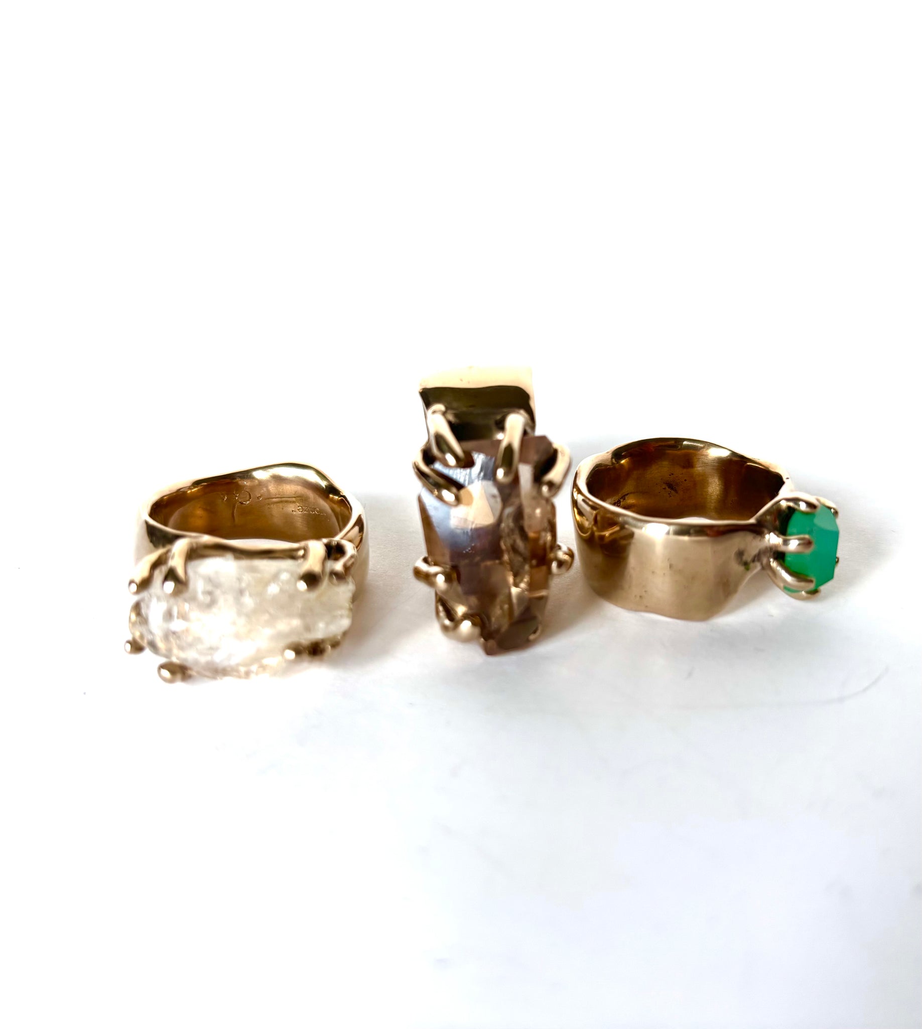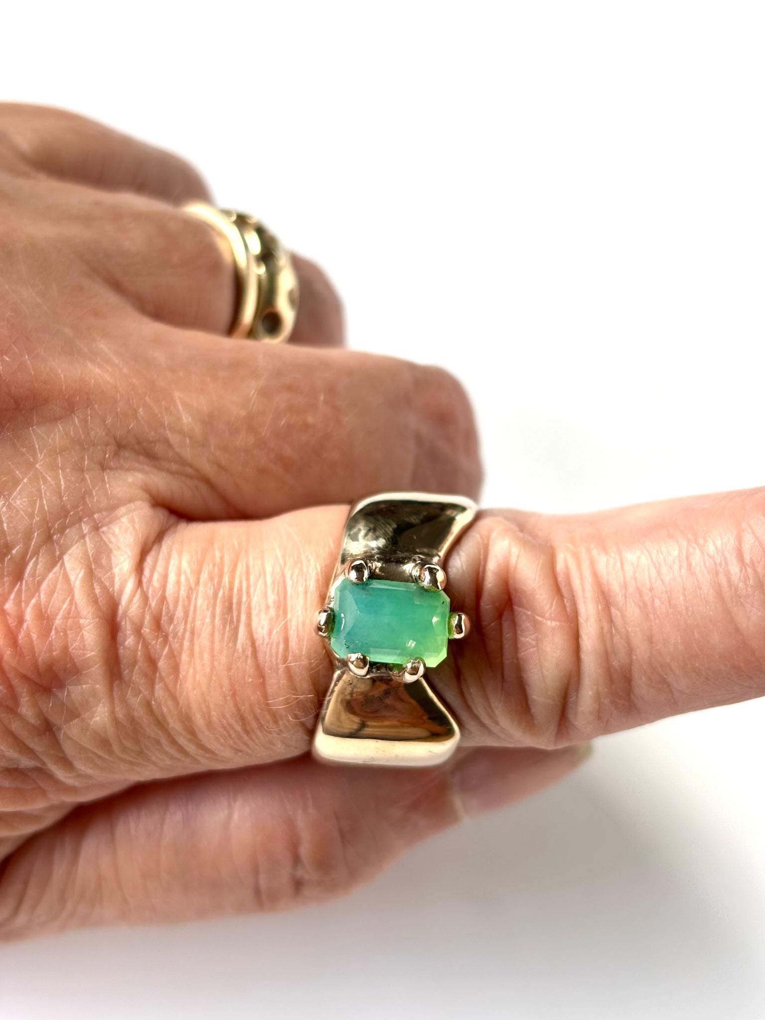 Chrysoprase ring - emerald cut and faceted Chrysoprase stone set in bronze clay set ring. Stone is approx 1cmx1/2cm - size 8.75 - one of a kind