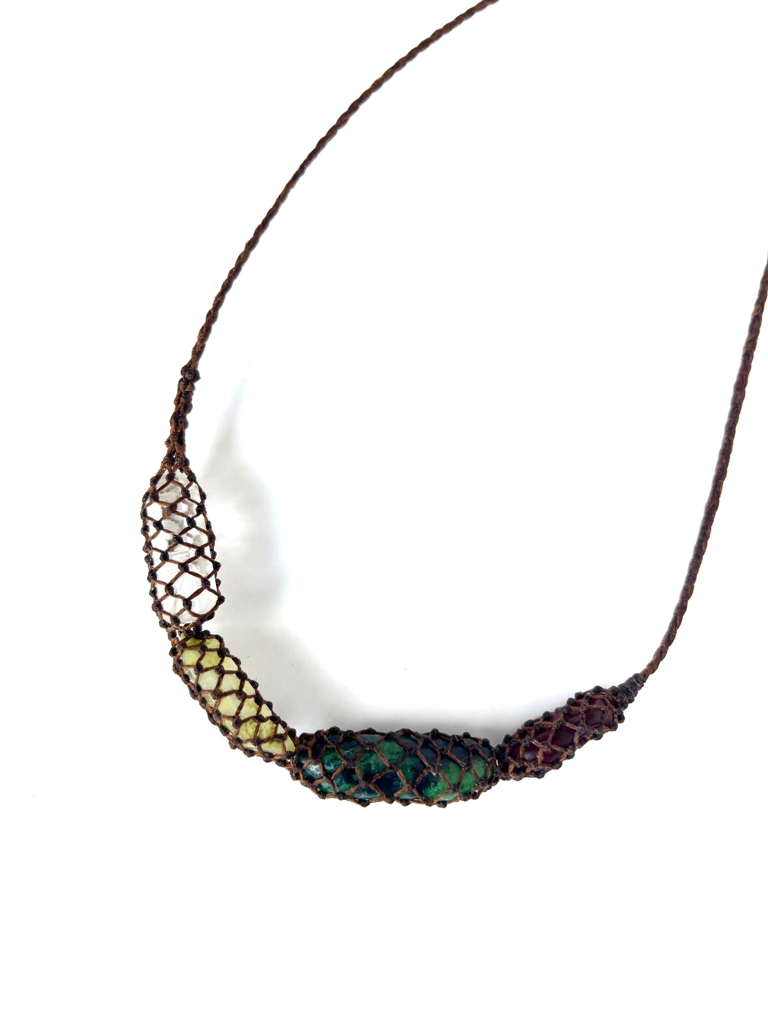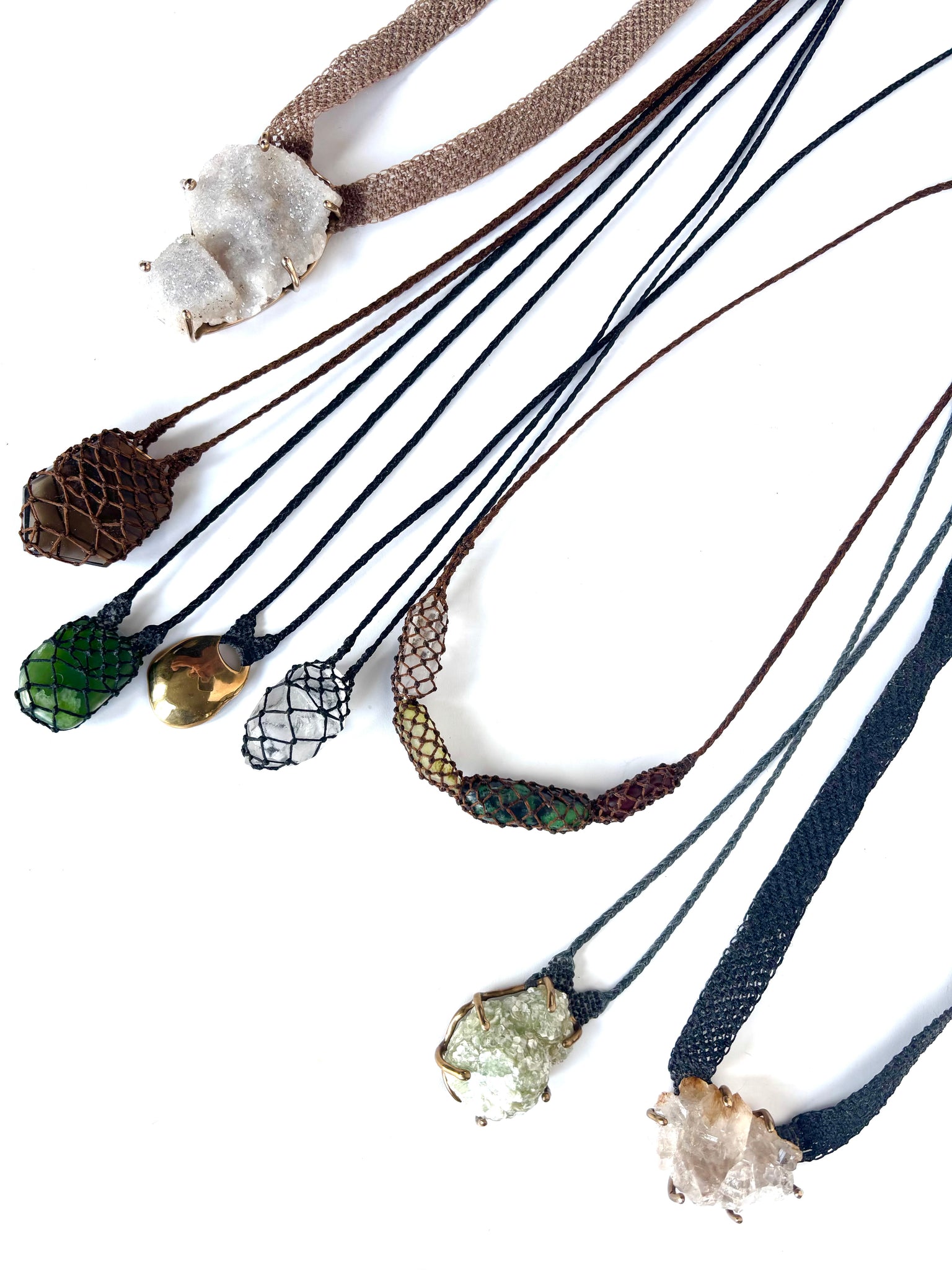 I made these because if I’m going to be honest one crystal is never enough! (Says the girl who has a house full of crystals!) but I really think it’s true - the attraction is deep and in the case of crystals the more the better. This piece is Quartz, Dream Quartz, Amazonite, Gobi Agate. Quartz the amplifier, healer, and attuned your spiritual purpose. Dream Quartz has a tender nurturing energy and can revitalize your energy, and immune booster that can help with getting a restful sleep. Amazonite can help to block stress and protect against electromagnetic pollution and can assist you to bring optimal health. Gobi Agate offers grounding and protection. All netted together in a necklace netted in brown cord and is 18” with a sterling silver clasp.